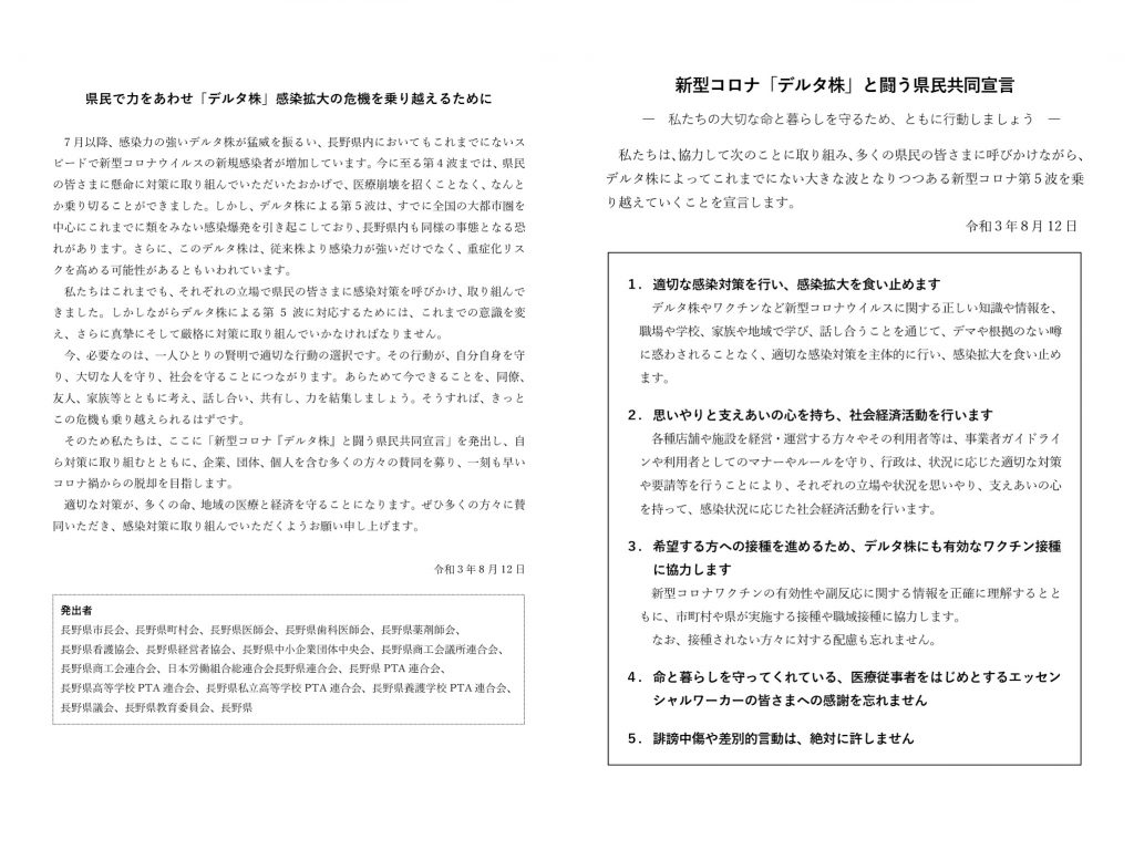 弊社は長野県及び各関係団体より発出された「新型コロナ「デルタ株」と戦う県民共同宣言」に賛同し、